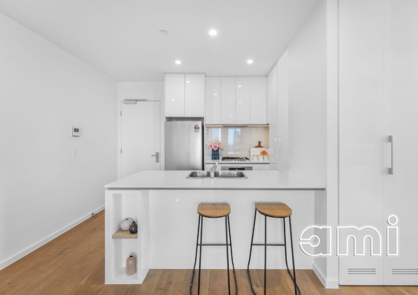 Bathed in natural light throughout the day, the expansive open-plan living and dining zone is framed by full-height glazing and seamlessly extends to an east-facing balcony, perfect for enjoying morning sunshine and sweeping skyline views. A second south-facing balcony further enhances the indoor–outdoor flow, offering an elevated outlook across the city and, on clear days, distant blue-water views stretching toward Port Phillip Bay—a truly impressive and versatile living experience.